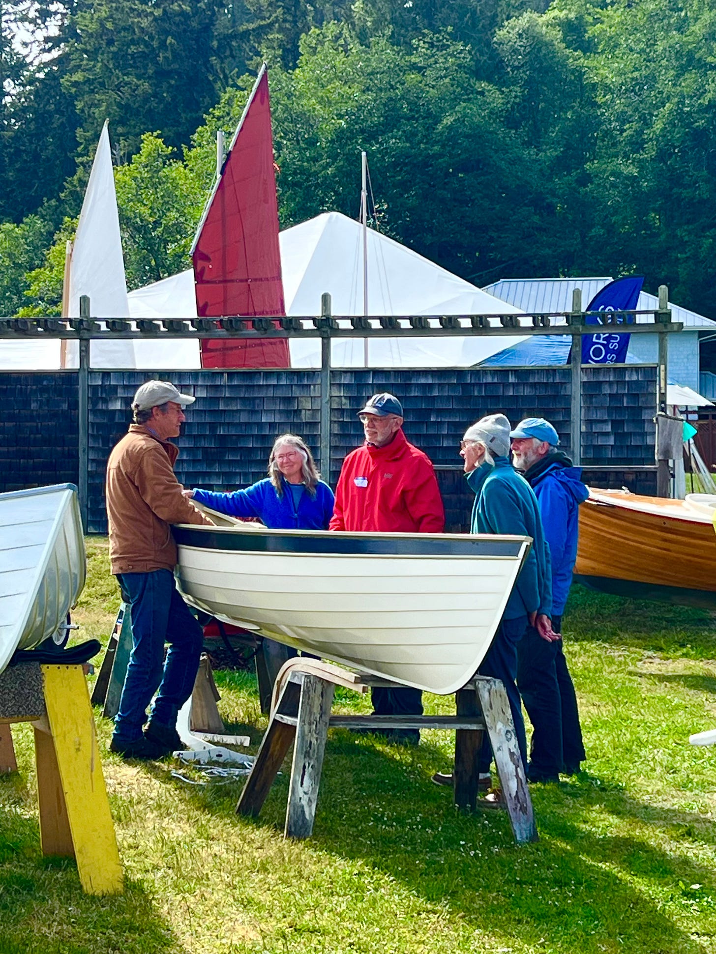 Among boats displayed ashore was EBB, Tom Regan’s fast, slenderized version of a 16-foot Lake George Boat, weighing in at just under 100 lbs. Here, Tom talks about rowing boats in general, how he built EBB using 4mm Okoume planks and delicate-looking Alaska Yellow Cedar frames on 6-inch centers…all to produce a pulling boat that’s only 60% the weight of a stock Lake George Boat. (Now officially retired from his years as proprietor of Grapeview Point Boat Works, Tom continues to spend Saturdays instructing others at the non-profit Gig Harbor BoatShop.)