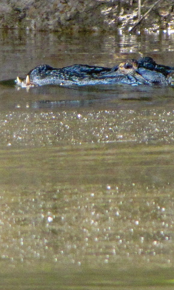 We saw our first alligator, and then another. They didn’t look to be thirty feet, but they were intimidating, even at a distance. One came off the bank with a big splash, then paced us for a minute before turning toward the bank.