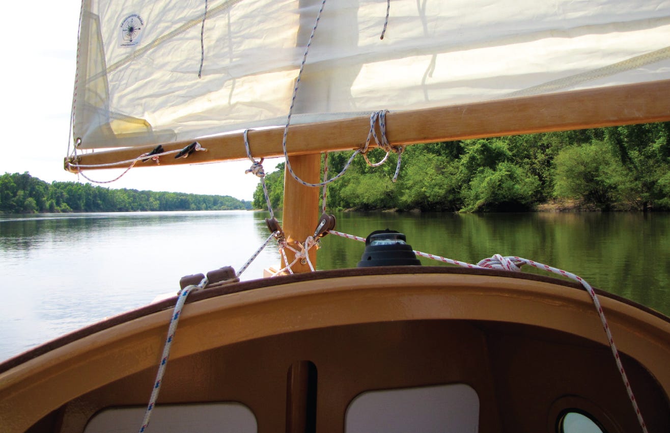 Pam, my wife, stood ready to take pictures from the floating dock as we shoved B. Frank’s nose upstream with the helm over. The current turned us downstream, and we were underway. The sail filled, and we ran quickly, with Pam scrambling to get pictures before we were out of range. The GPS quickly passed 5 mph, then 6, and stayed around 6.5. The wind was not strong, the river nearly flat, and the sailing effortless, with B. Frank touching 6.9 several times. It was pretty clear that Scamp pays little attention to hull speed and piques the curiosity as to her potential.