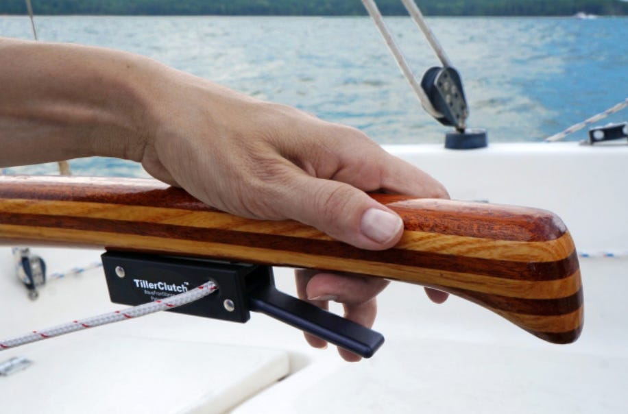 Way better than tiller clutch or tiller tamer is the “helm impeder” from the British Dinghy Cruising Association, 2008. Easily assembled and with easily adjustable tensioning. See it on you tube; search for “Huntingford helm impeder” posted by Nick Crabbe. Cost is less than $20, but you probably have the stuff already laying about. I’ve used this on 16’ day sailors and dinghies. All these devices stabilize the rudder but don’t maintain a particular course like the electric tiller pilots.