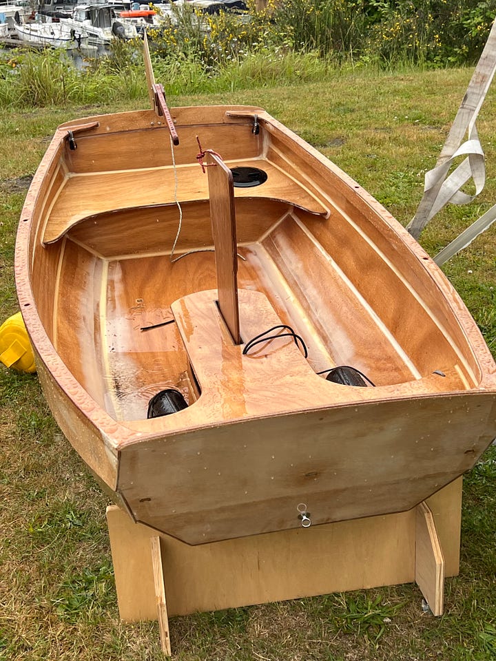 Here are some shots of the under-construction prototype, which made its debut at the recent Port Townsend Wooden Boat Festival.