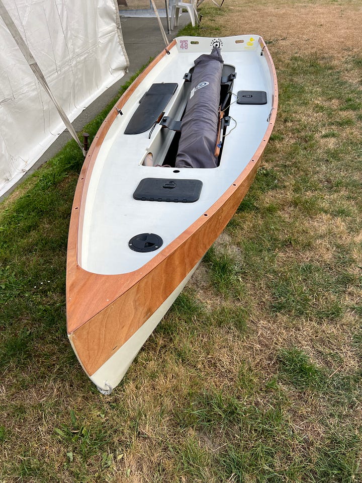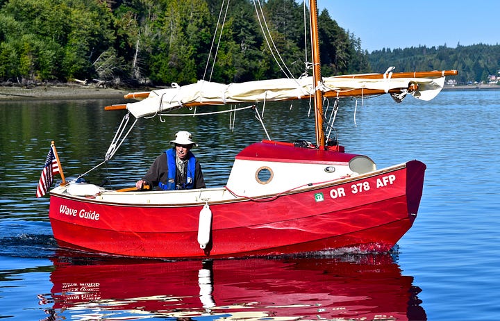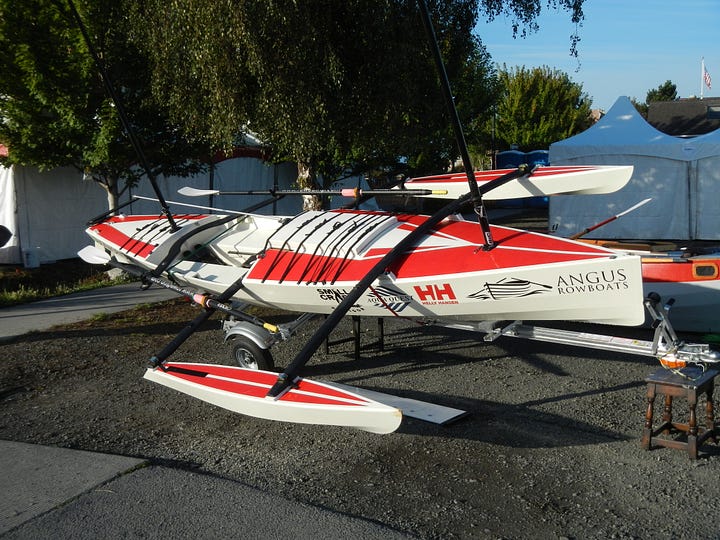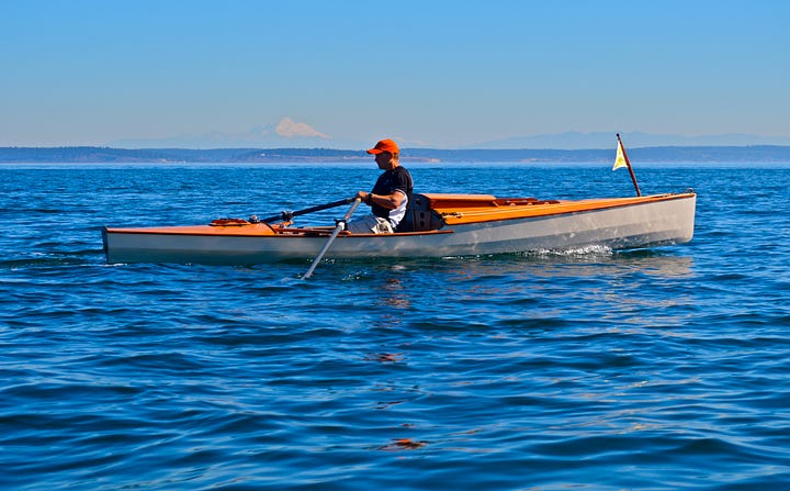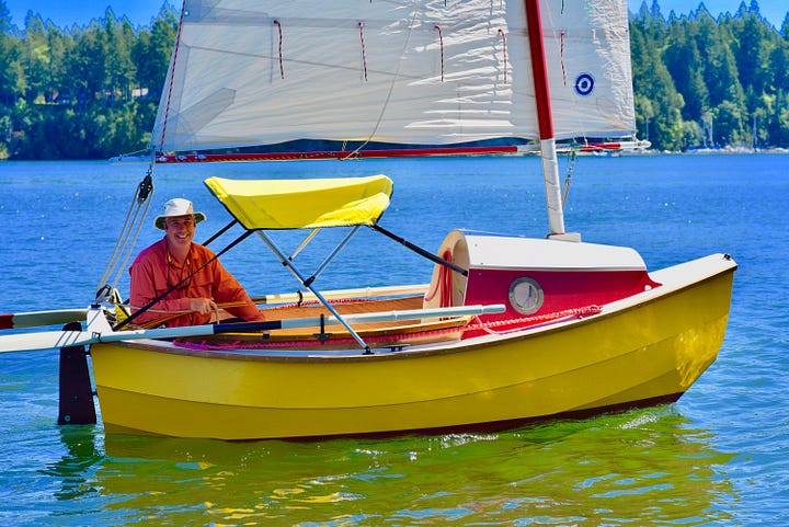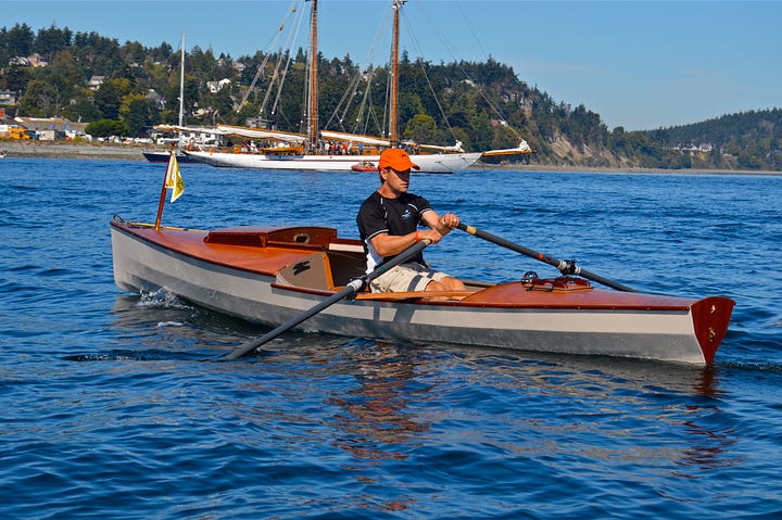 The Colin Angus-designed RowCruiser is a breakthrough sliding-seat rowing boat with sleep-aboard capabilities and an optional sailing rig that has taken a few builders from Port Townsend to Ketchikan during the Race to Alaska. As a pulling boat, the RowCruiser is fast, extremely seaworthy and surprisingly comfortable when you bed down in under the forward raised deck. (I built the prototype RowCruiser, featured in an Off Center Harbor video, and enjoyed overnight cruises aboard the boat. The trimaran sailing version was developed later by designer Colin Angus, and features affordable stock sails originally intended for a small class racing sailboat.)