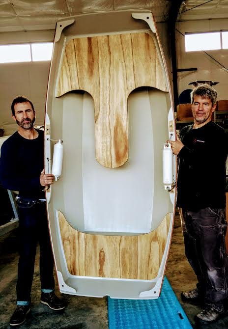 We put together the first prototype in short order, then developed a simple sailing rig. That small hull is shown here, with Josh Colvin on the left and Brandon Davis on the right.