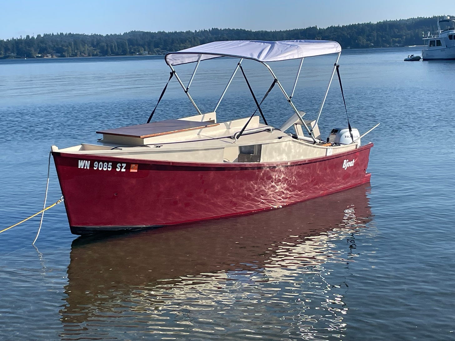 From Lee Bjorklund: This is Bjoat, a 16’/15 hp AF4B that is Anchor-Buddied on the west shore of Blake Island in Puget Sound.