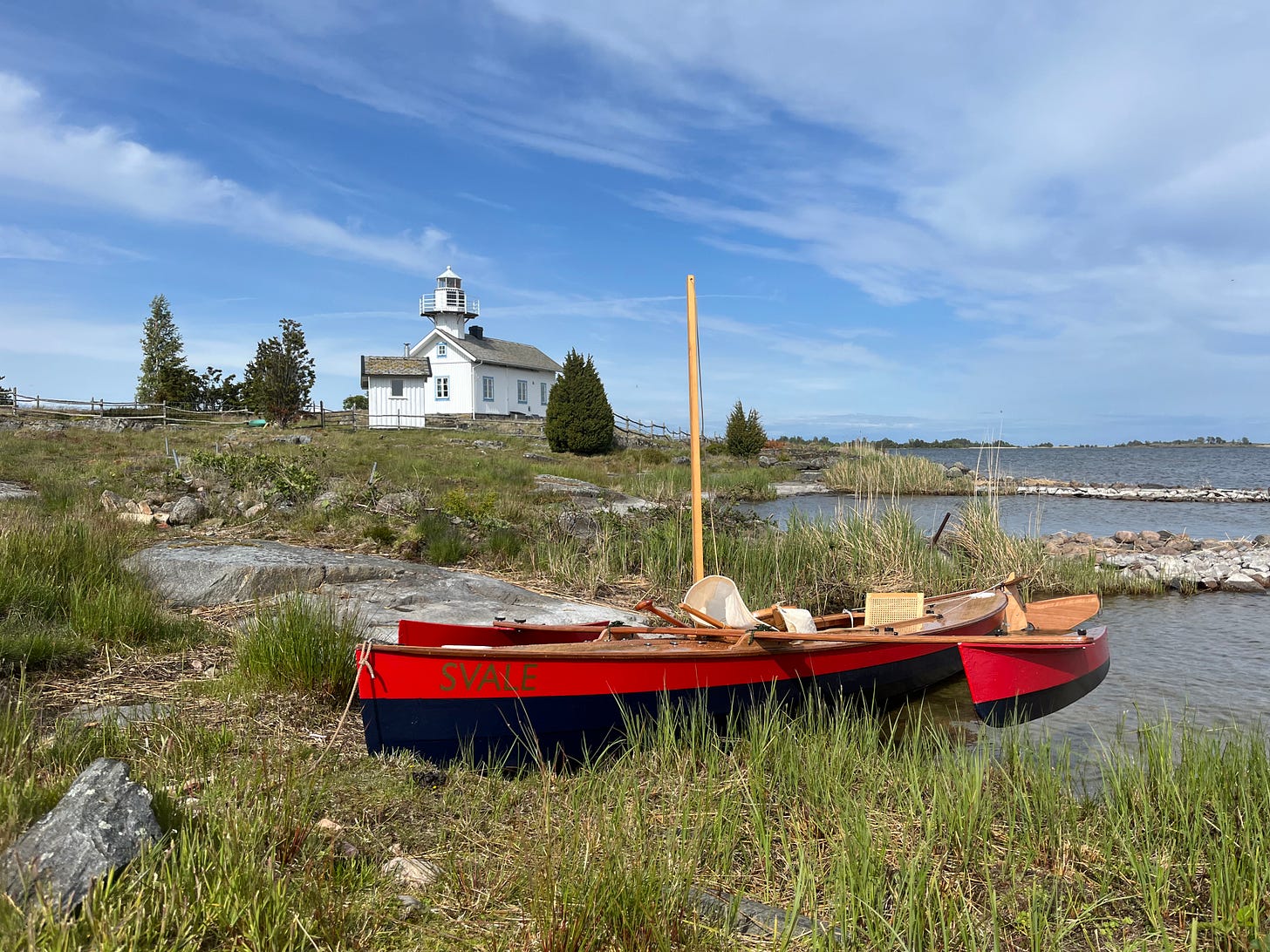 From Guy Hall: Here is Svale in Gunnarsholmen on lake Värnen in Sweden during a Dinghy Cruising association meet there in June 25. This day was blowing 25kts + and most didn’t venture out. I put the mizzen in the main mast step and enjoyed a fantastic sail with the reduced rig. Here we are having a lunch stop as far as I got that day.
