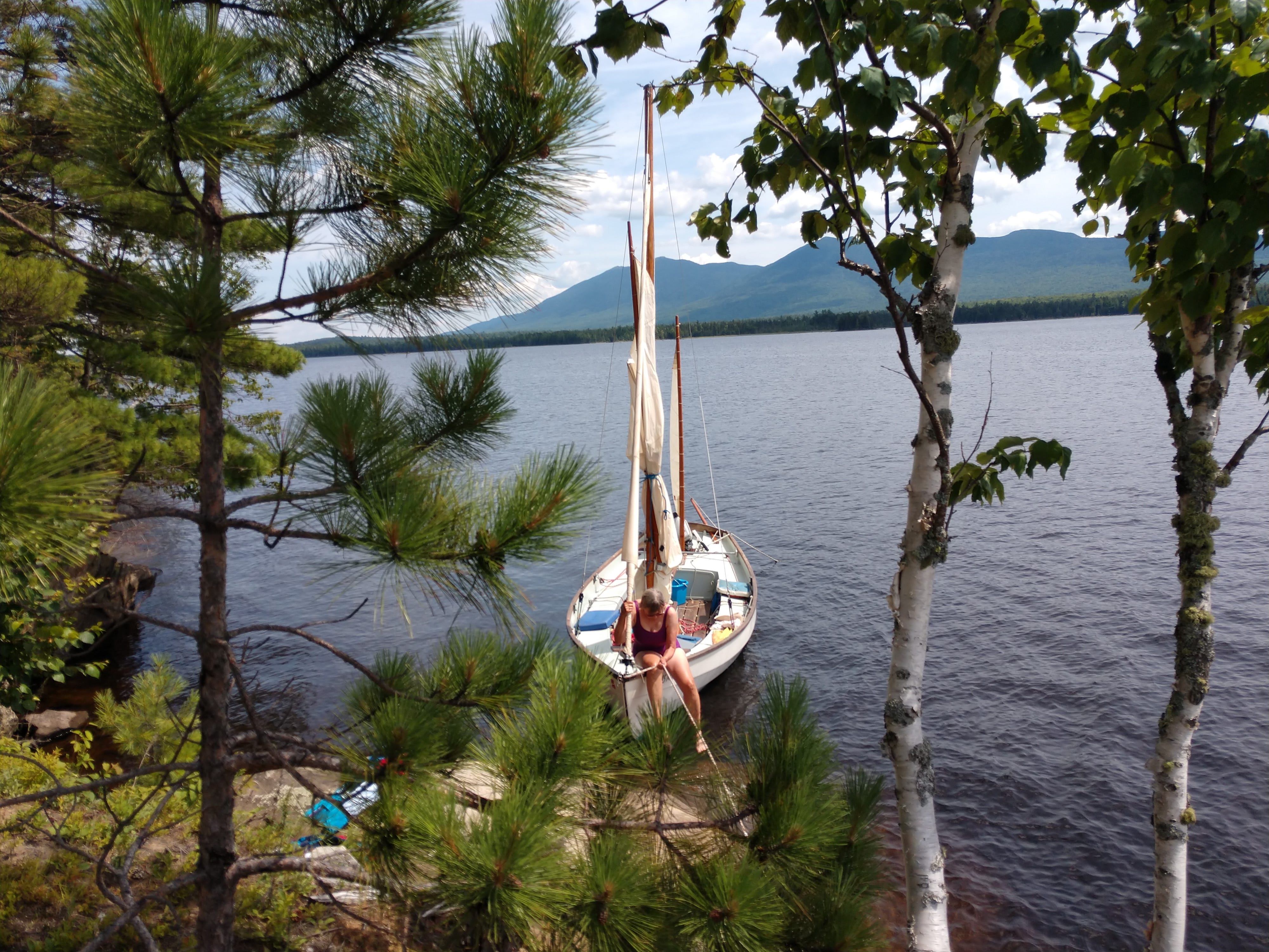 From Tom Hildreth: Drascombe Longboat lunch and swim stop Flagstaff Lake, backside of Bigelow Mtn, Maine. Only sailboat on the 25 mile long lake.