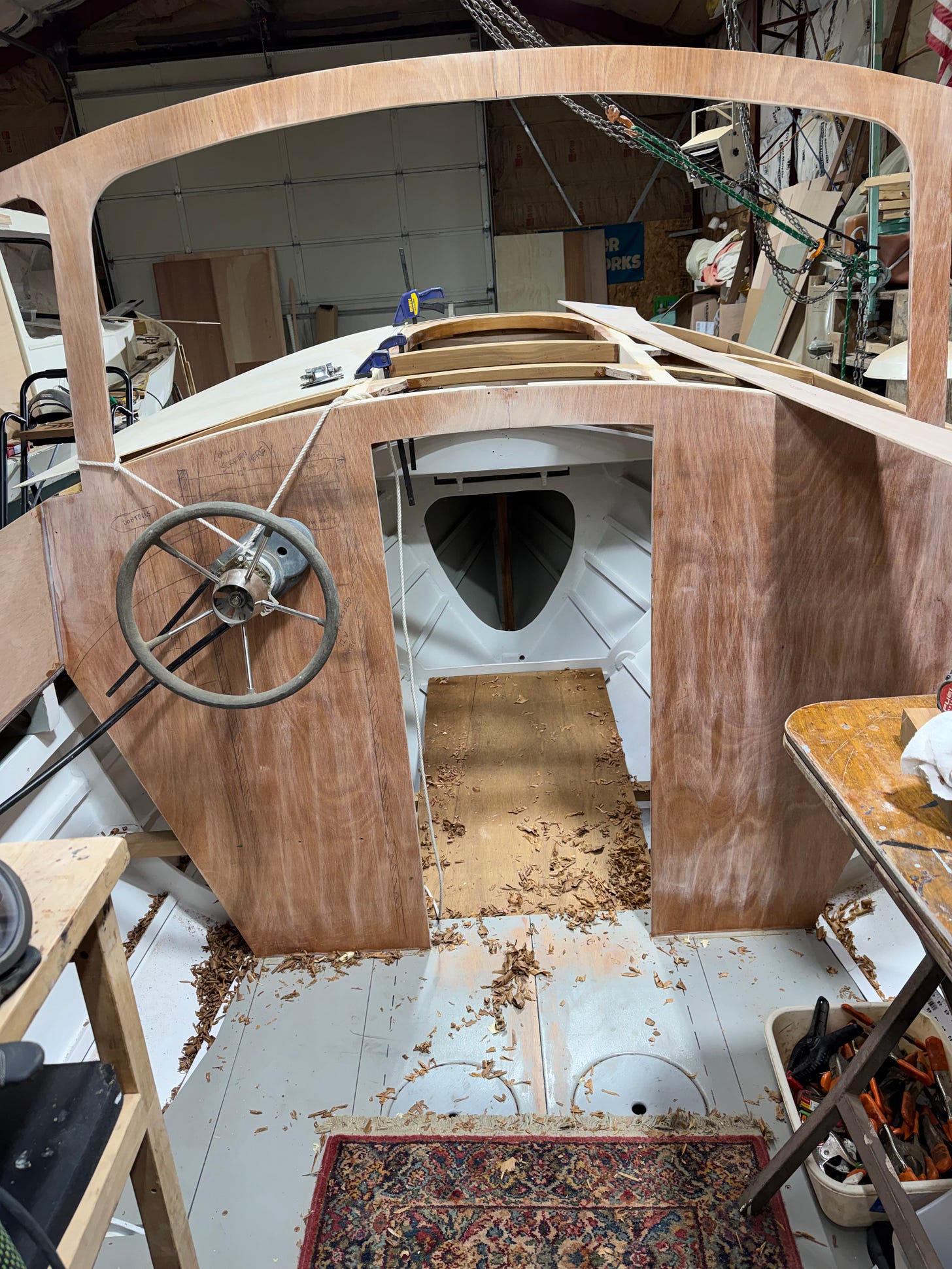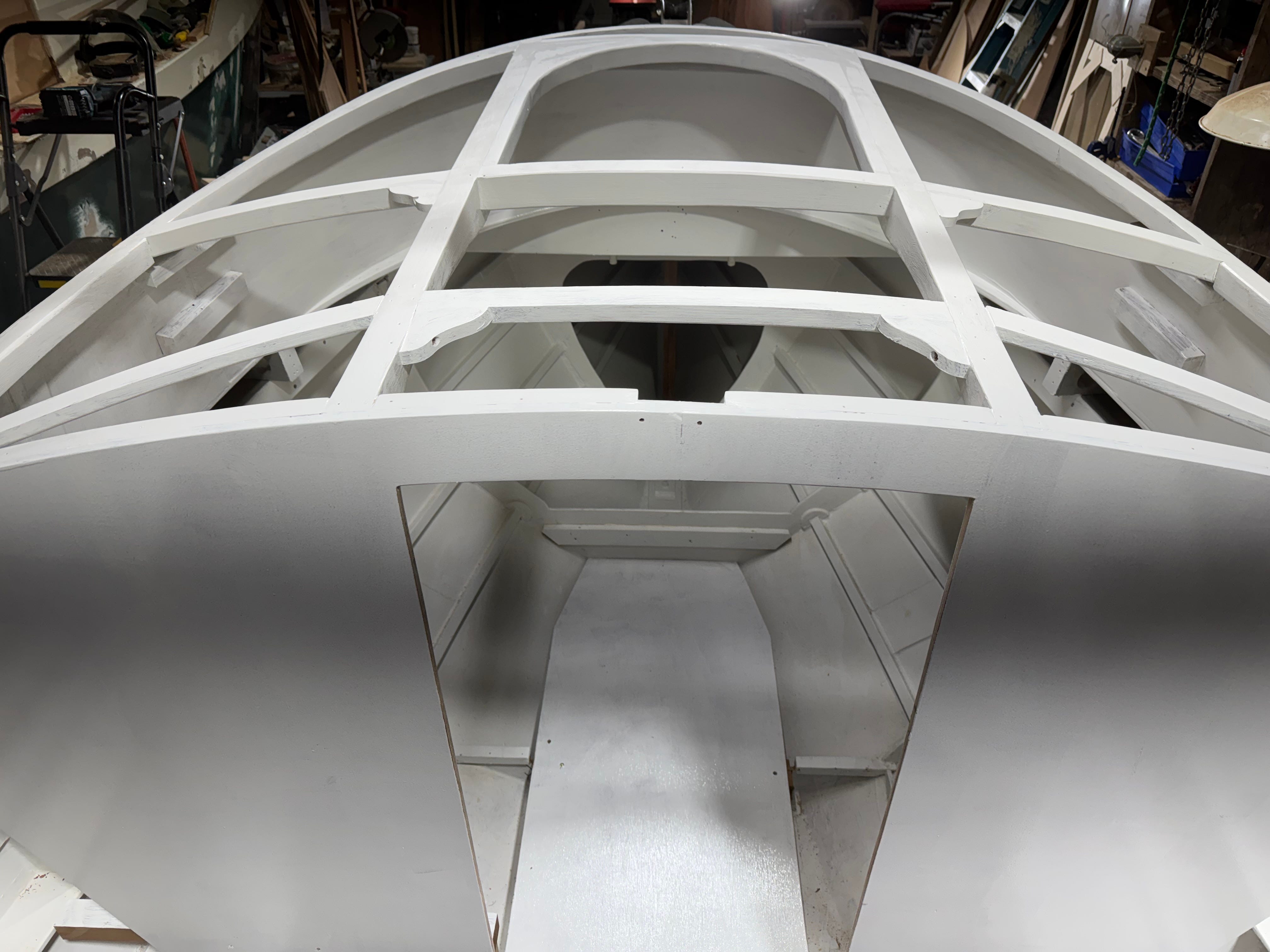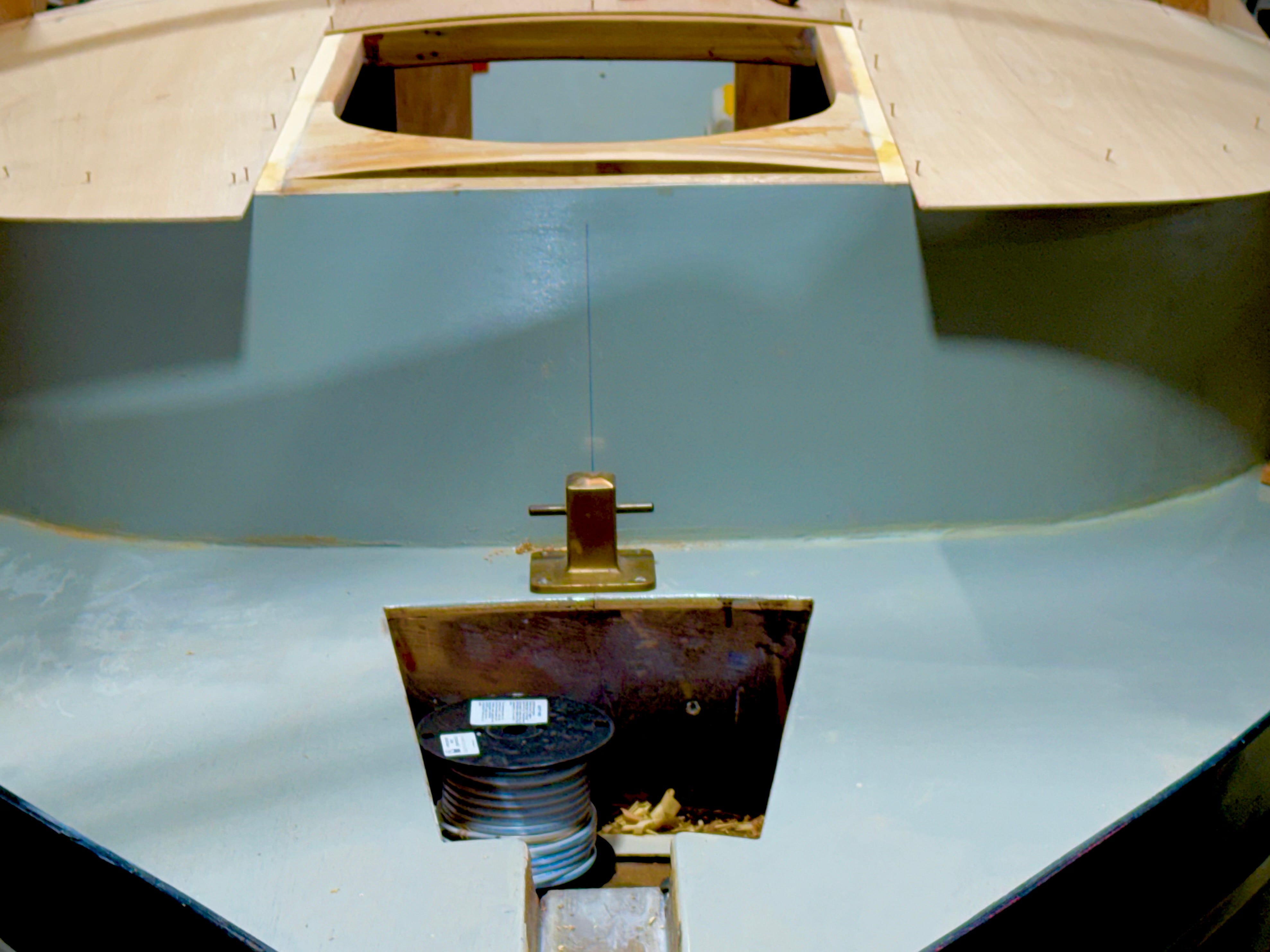 Above - One of yesterday’s jobs was to apply a first coat of Ammonite to the cabintop frames. Later, after we’ve done a bit more work inside the forward cabin, we’ll glue and screw the 6mm ply cabintop panels in place, in preparation for work on the three-pane windshield. During this week’s three-day session, we’ll build the mahogany helm console, and temporarily attach it to the portside bulkhead to test routing and effectiveness of the steering cable, hoping it’ll turn the rudder smoothly—something we’d like to confirm before going much farther.
