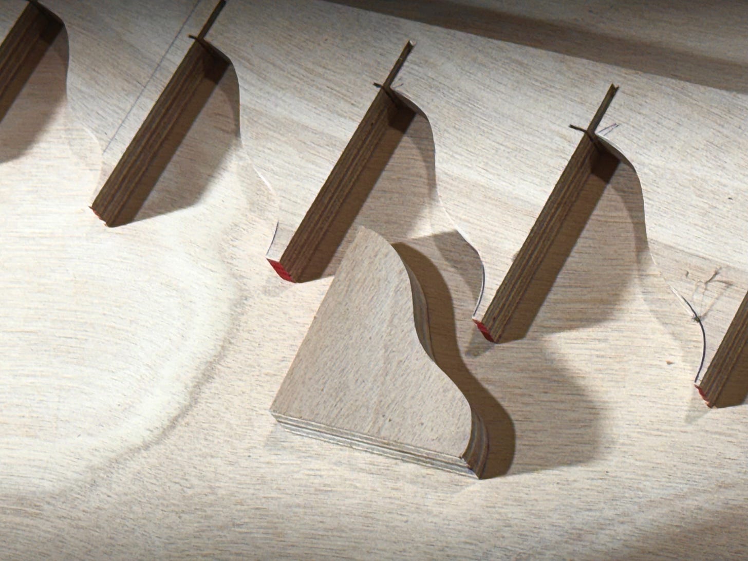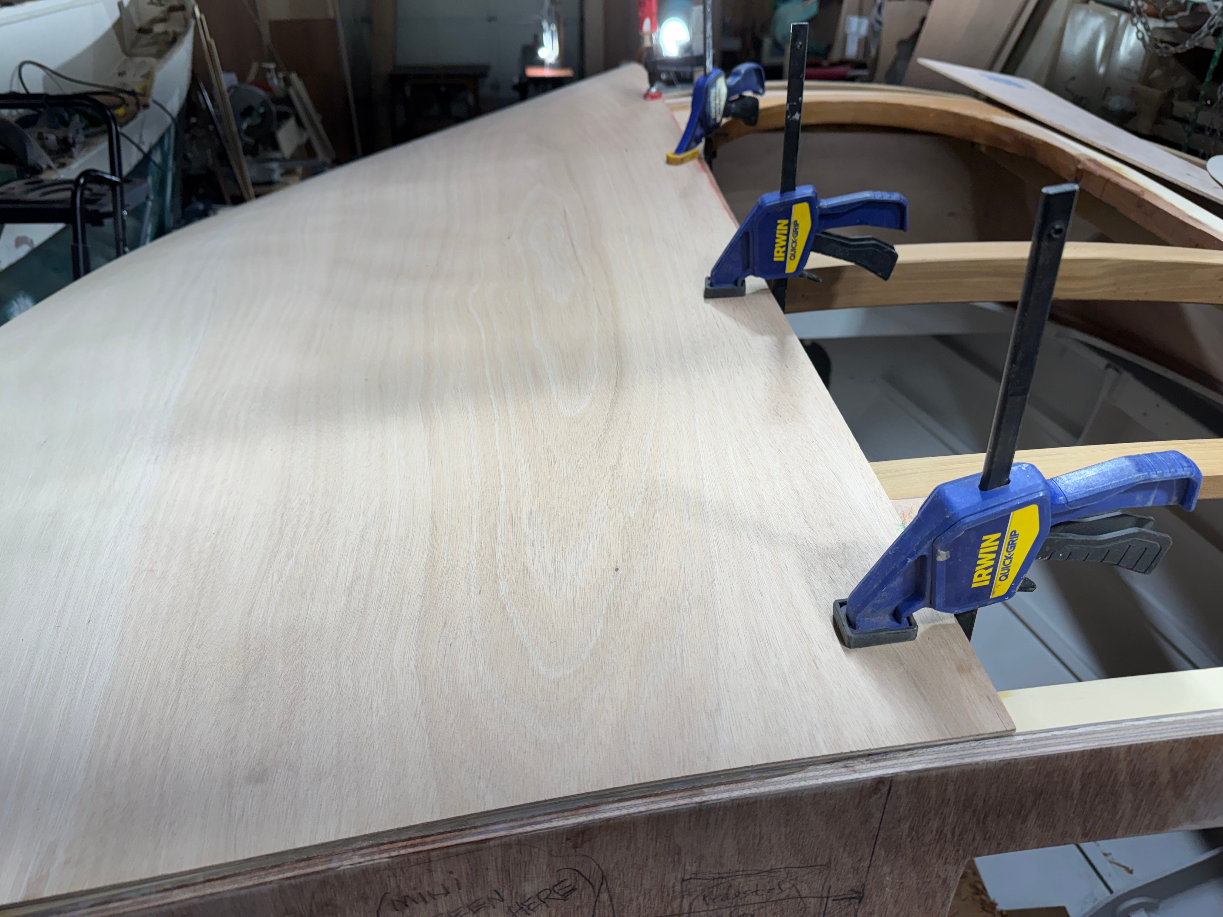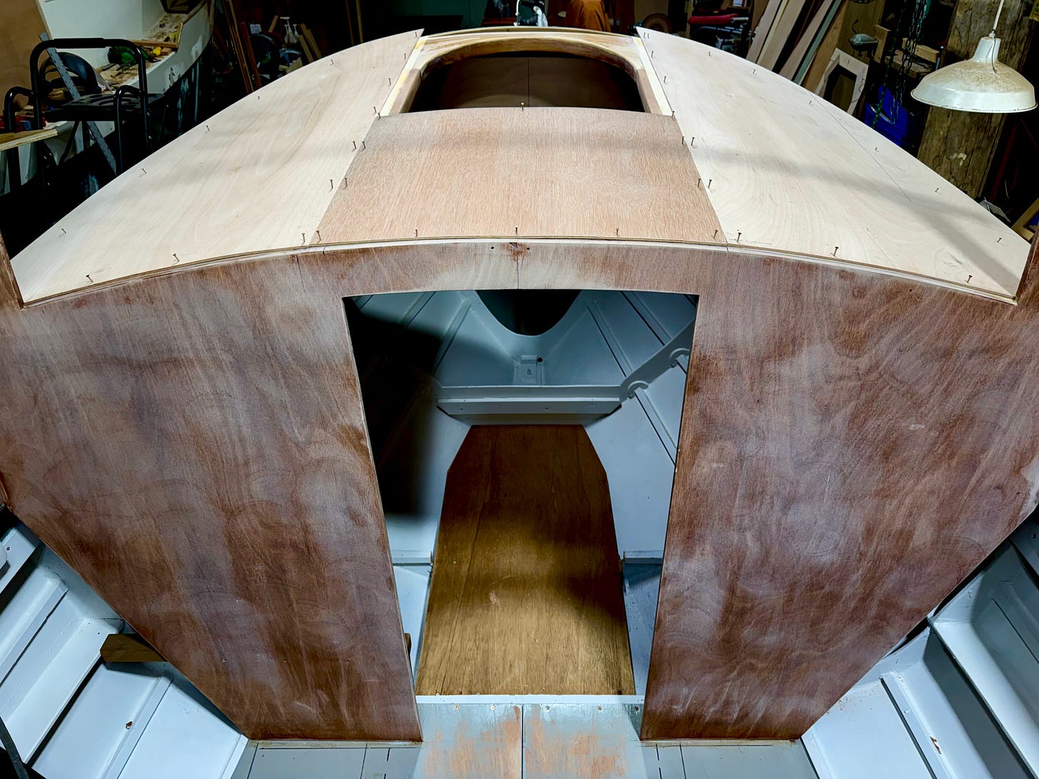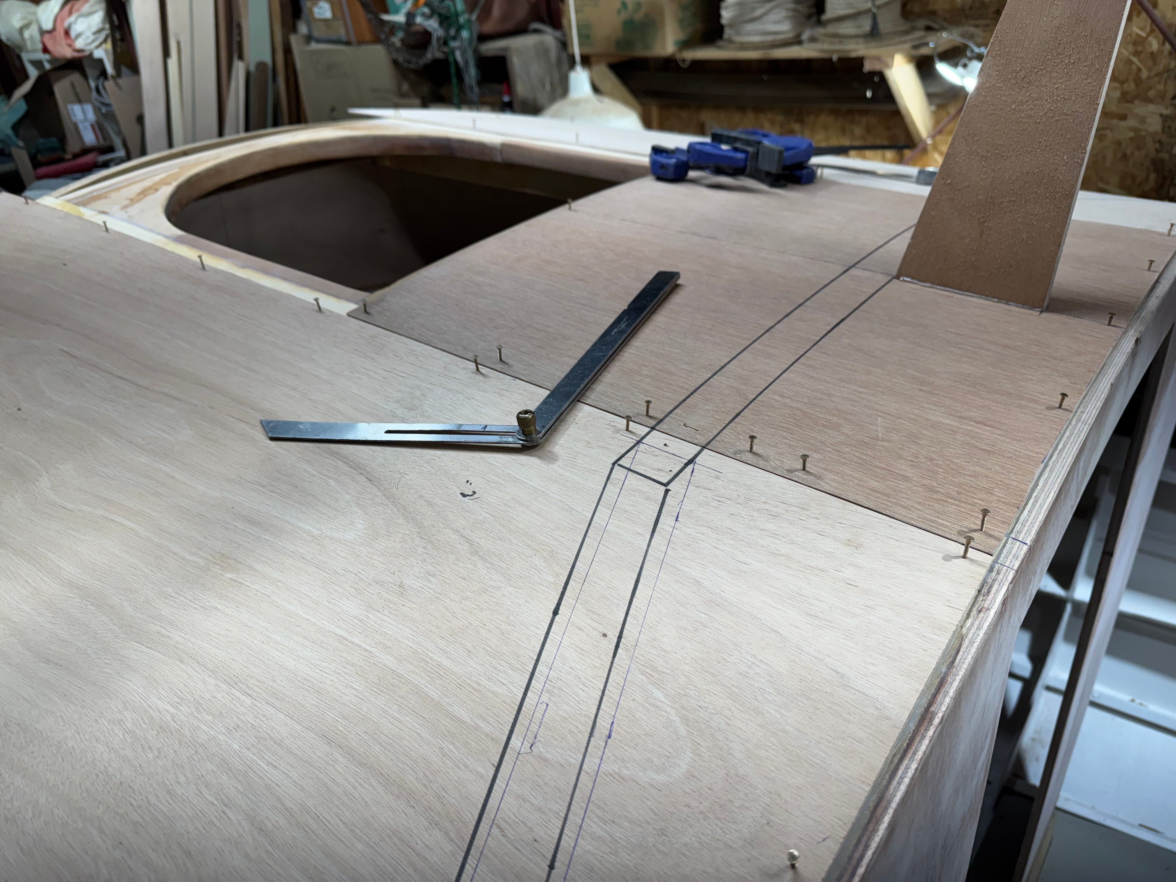 Above - In order to make accurate patterns for each section of the cabintop, I used 4mm Okoume for each side piece, and 4mm Hydrotek (stiffer, less bendy) for the center panel. These patterns will later be traced onto the final cabintop panels that’ll be 6mm (1/4”) marine ply.