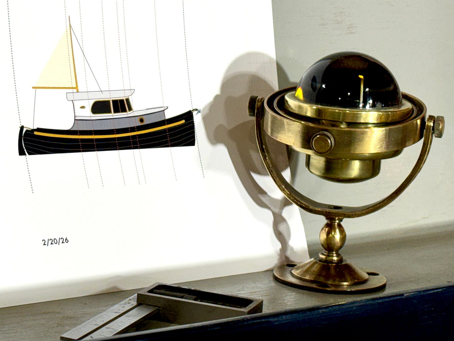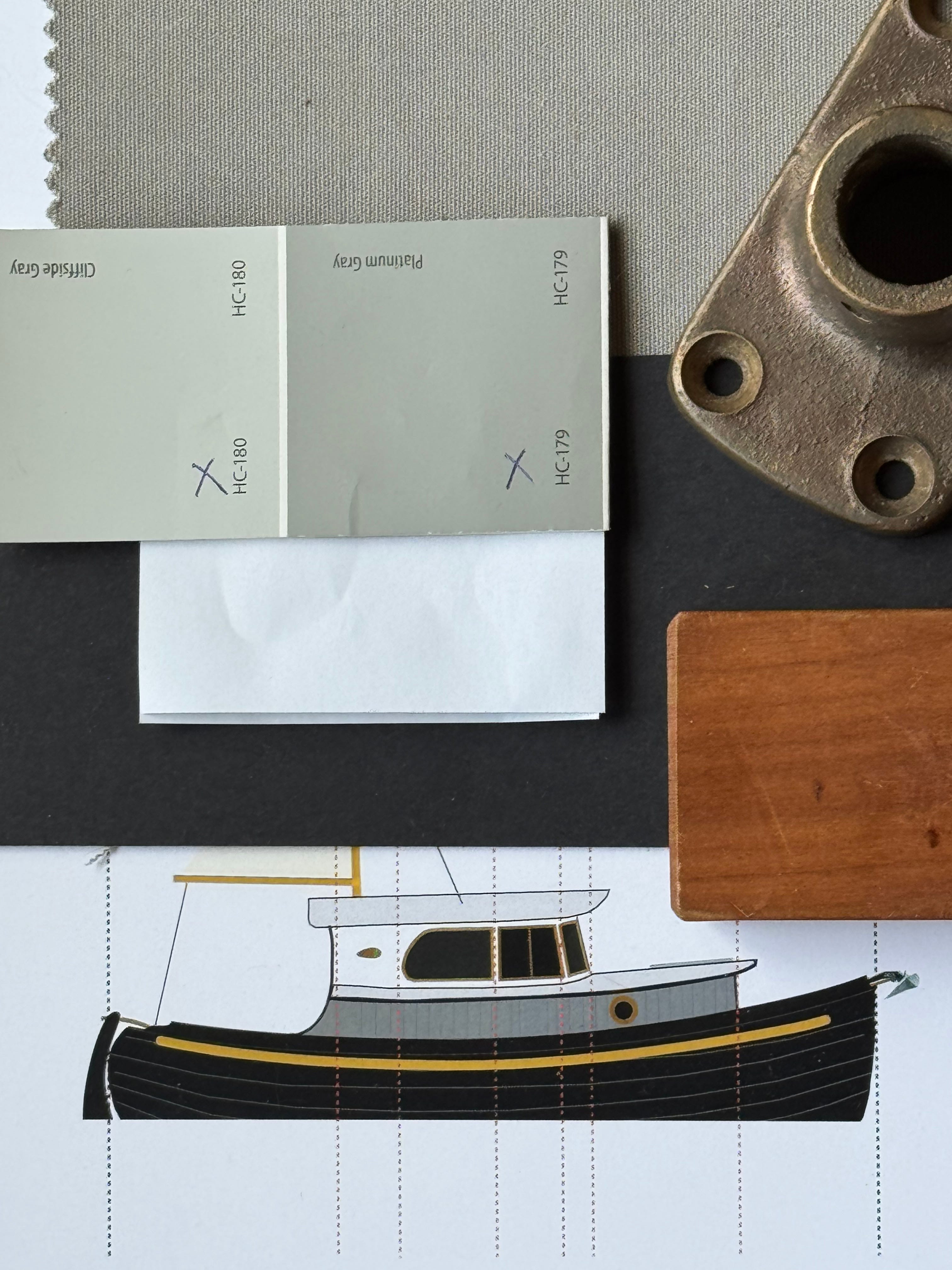 Above - Let’s talk about colors…a subject we’re always thinking about during projects. The colors aren’t well-represented here, in terms of exact shade, but at the top you see Sunbrella’s Cadet Grey, that’ll likely be used as part of a shelter over the aft cockpit. Next is a color-chip from Benjamin Moore, showing their Cliffside Gray (the lighter shade) on the left, and Platinum Gray on the right. Bronze deck hardware will be part of the mix, along with bits of stained and varnished wood. The hull will be satin black, from Marshalls Cove Marine Paints, and the off-white side of the pilothouse will possibly be Farrow and Ball’s Ammonite, mixed by Marshalls Cove. This doodle of the boat includes a sort of golden accent stripe, but who knows? Everything is still up in the air, color-wise, but our basic concept is too go with a subtle mix of workboat colors, in satin, hoping to avoid looking too “cute” or “adorable,” while knowing our little 20-footer will draw many such comments.