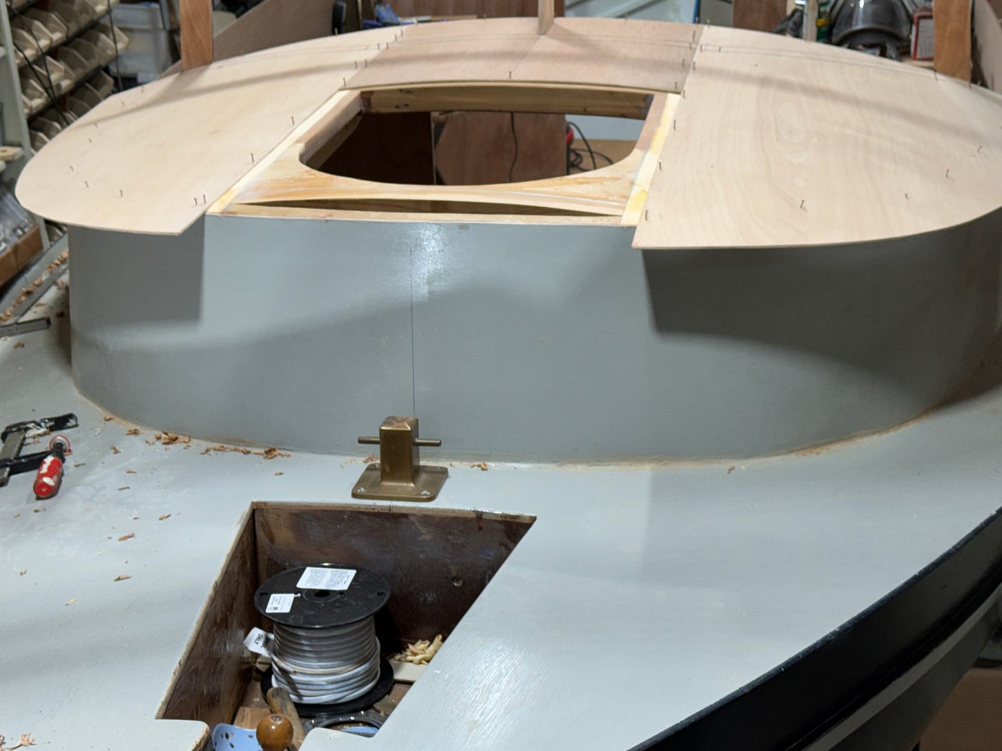 Above - First view of the three main pattern panels tacked gingerly in place with small bronze ringshank nails. At this point the overhanging eyebrows are generous—they’ll be trimmed back to about a 1-3/4” overhang later, when the actual cabintop ply is laid down, making sure that all panel joints are aligned just right. (Later, 1/2” x 1-1/2” cedar edging will drop down from the cabintop edges, adding stiffness and helping to lower apparent height of the cabin’s side walls…a little trick that might help with overall aesthetics.