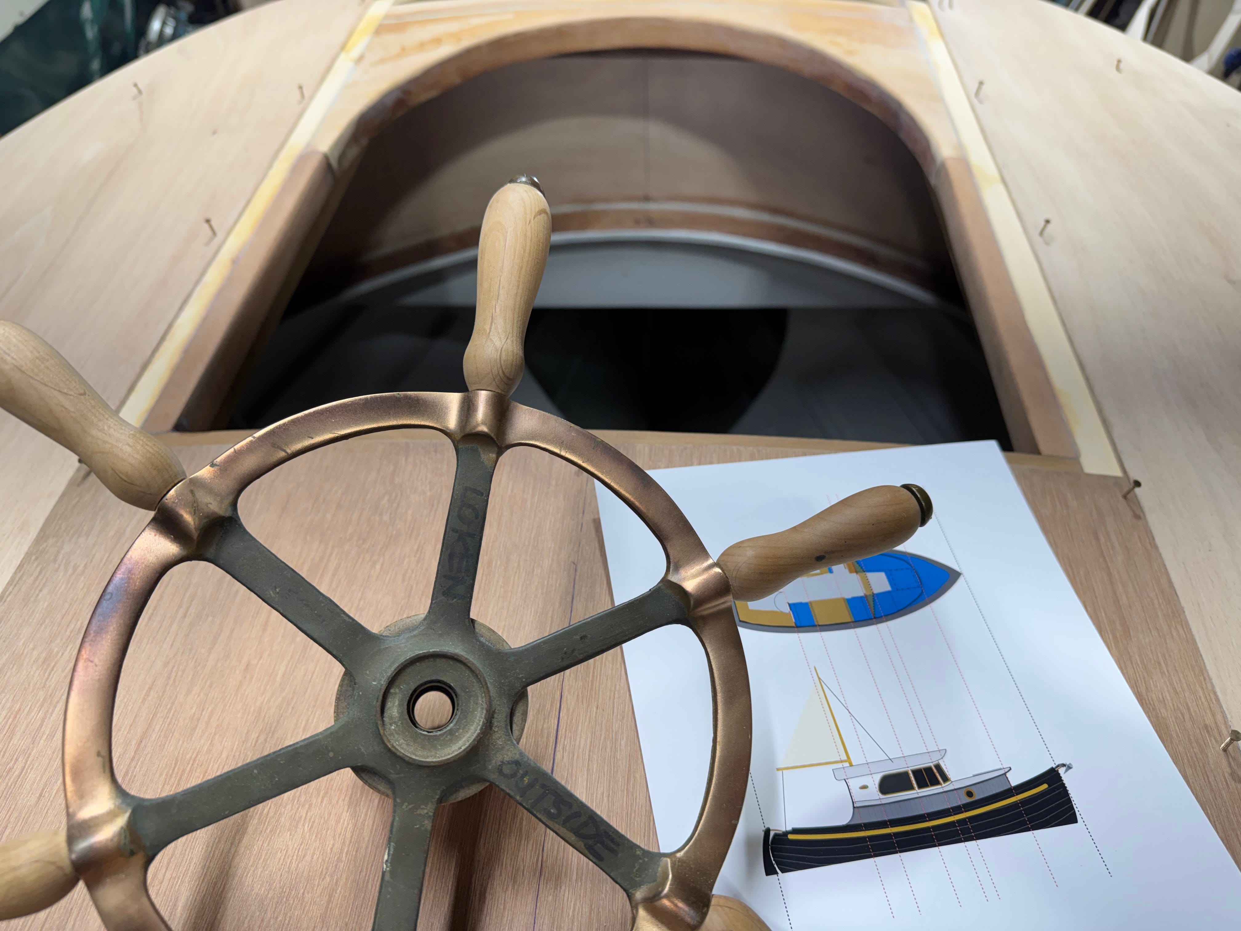 Above - While finishing patterns for the cabintop, we got sidetracked, (I know, you’re shocked) fussing around with a used Teleflex steering helm and cable, calculating that we’d need a new 14-foot cable to steer the sailboat rudder via a side-mounted bronze arm. More on steering later, but as you probably guessed, the wheel you see isn’t what we’ll go with. See below. (Also, the upper portion of the cabin bulkhead will temporarily support the pilothouse roof—two laminated layers of 4mm marine ply, to be made outside of the boat, on the shop floor. Once the cambered, self-supporting pilothouse roof is lowered over the fore and aft bulkheads, the windshield frame will be built over the forward cabintop…with its uppermost edges snugged under the pilothouse lid. At about that point, the upper portion of the bulkhead you see here will be cut away and removed.)