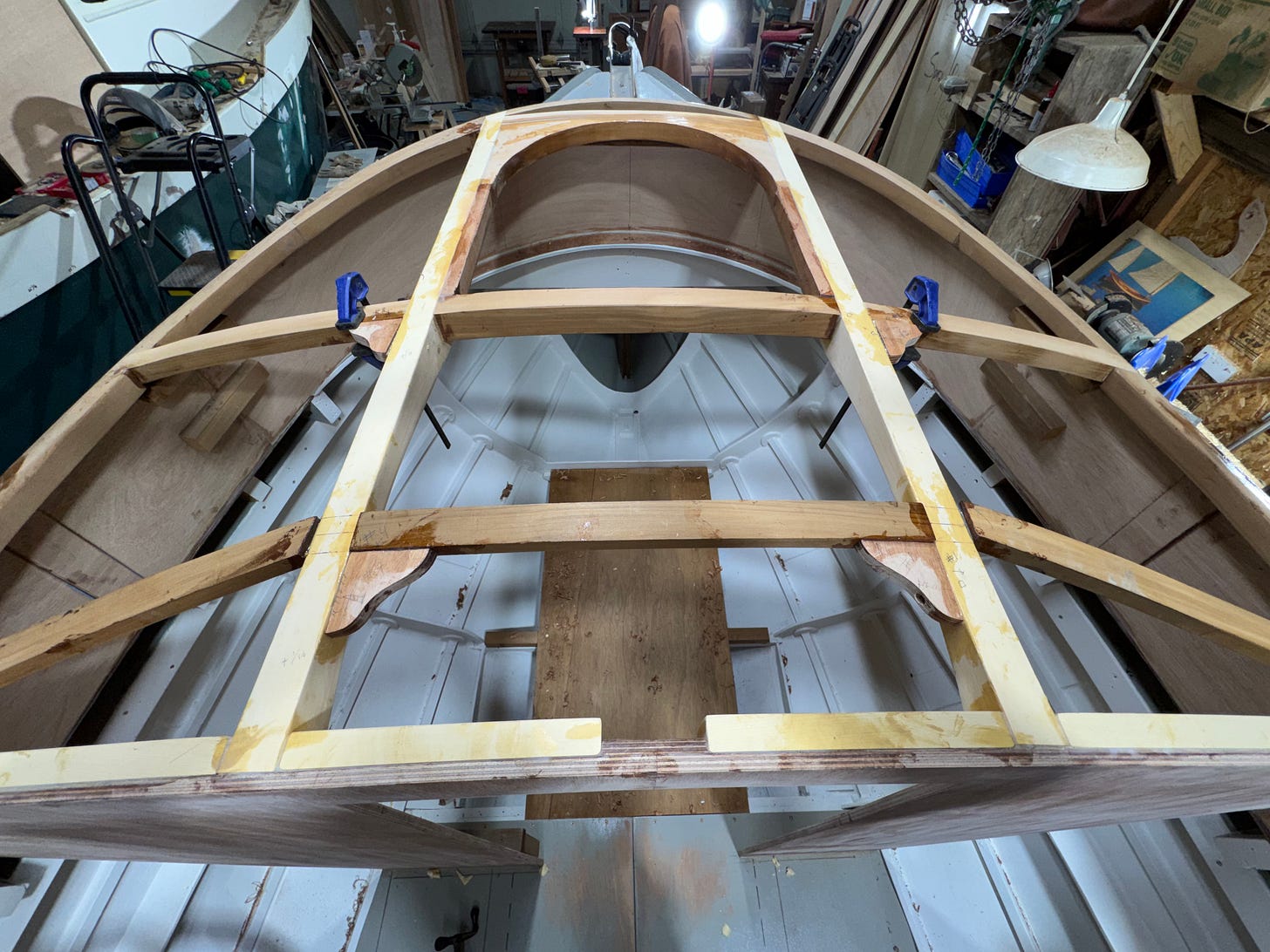 Last time, we finished framing of the forward cabin, so that’s where we resume, with the photo below. One addition you might notice—some small corner knees that had been epoxied in place shortly before the photo was taken.