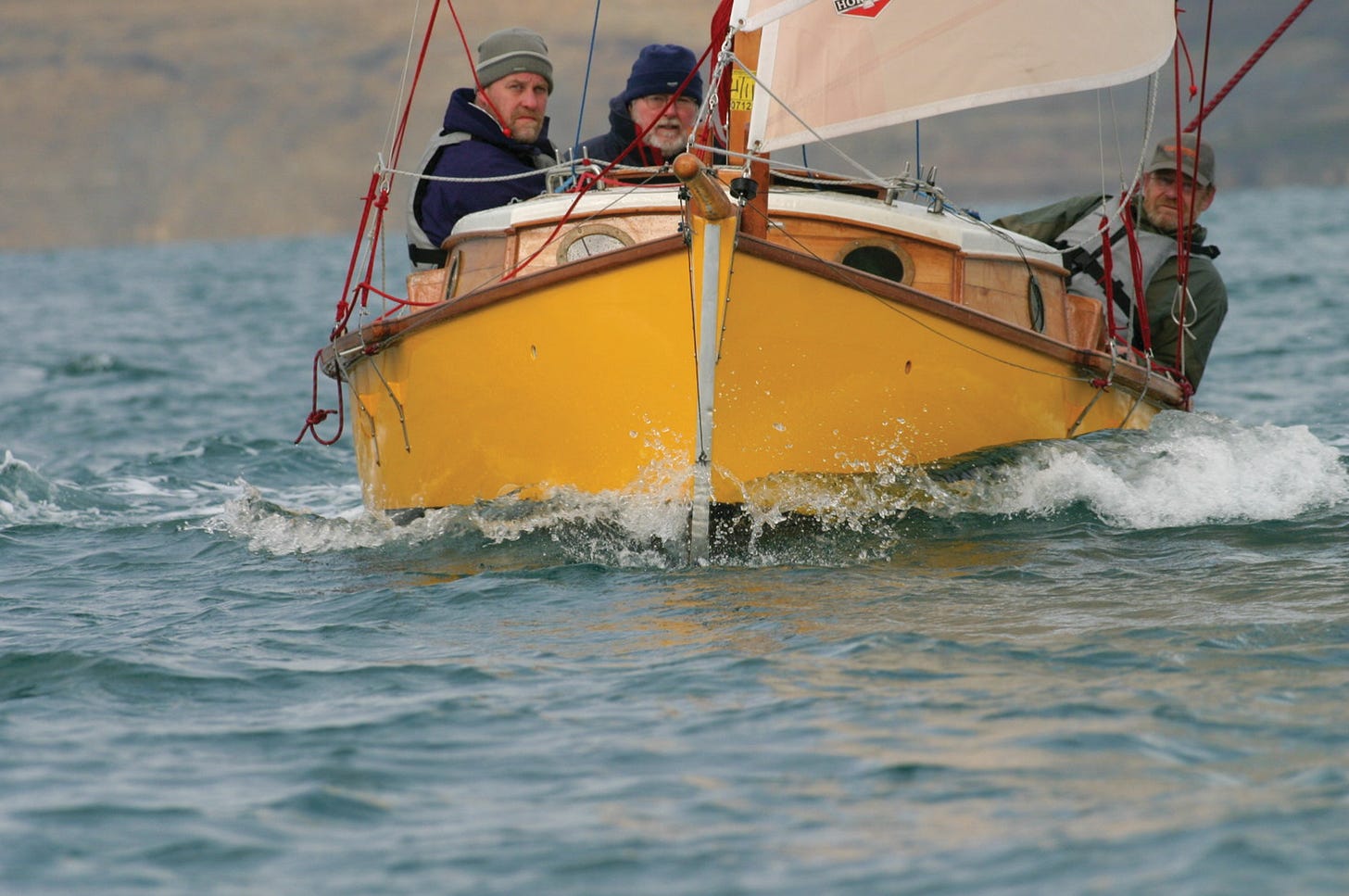 With an all up weight of 600 to 650 kg (around 1400 pounds, depending on fit-out and trimming ballast), she is amazingly light for a ballasted keel boat, yet on the water she is stable and stands up to her canvas well. I rigged her as per the 1932 Secret, a gaff cutter which, for the uninitiated is a gaff mainsail with a roller furling foresail (or staysail) immediately in front of the main and a jib set “flying” on the end of a bowsprit. A selection of these jibs including a huge reaching gennaker and a smaller heavy weather sail allows for infinite wind strengths while the main has two deep reef points. I peaked the mainsail gaff fairly high to enhance windward work and yet retain the low aspect power of the sail. A gentle roach with generous battens and a decent shape were the finishing touches. No topsails were envisaged, but our new 28-footer will carry a jackyard topsail—so called because the two “yards” on mast and gaff increase the sail way beyond the spar extremities. The jackyard is the one on the gaff; this sail is for serious sailors only and comes with a health warning. So it had to be a gaff cutter, the rig voted “most likely to engender unreasonable lust.” Complicated? Yes, a bit. Quick to rig? Not really but who cares? Lovely to behold? Oh yes! A delight to sail? Absolutely! Of course none of this matters unless the boat delivers big time and I believe this little boat does that—100%.