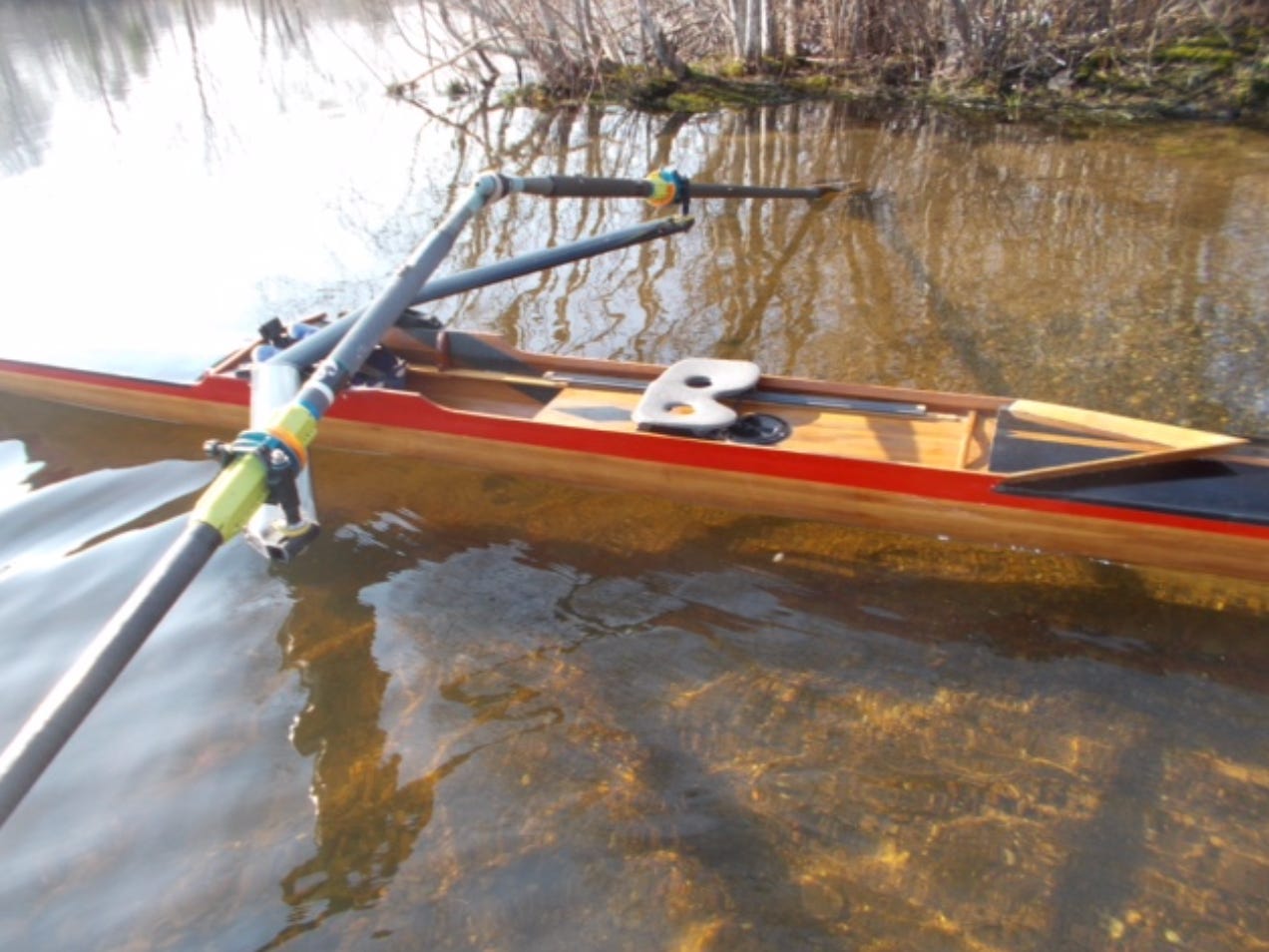 I built her some years ago to the body plan provided by Graham King, the great Australian shell designer and builder. I modified her somewhat with permission from the designer to accept a modern wing rigger, which I purchased from RowFit in Australia. The hull is built from 1/8” thick 3/4” wide, red cedar strips, beveled and glued. I covered both the outside and the interior with 2oz. fiberglass cloth set in epoxy. I eliminated the traditional ribs and much of the interior framing as being redundant with the wing rigger and monocoque construction. I further strengthened her to take the stress of the rowing stroke, with carbon fiber tape set in epoxy and vacuum bagged diagonally fore and aft on the inside, from the rigger shelf to the keelson. Cored carbon fiber was used for bulkheads. The deck is cored 2 oz. glass with a cedar detail rather that King’s more “soft” deck of heat shrunk Dacron.