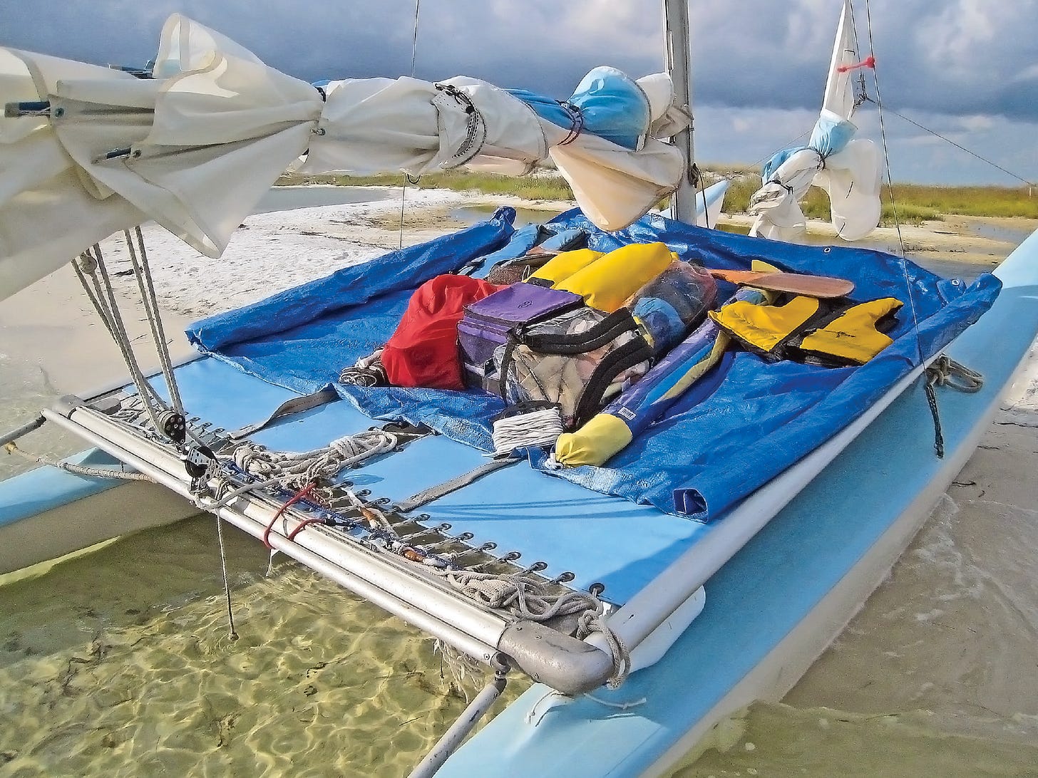 Years ago when I first experimented with the idea of the Hobie being a land/sea sailboat, a friend and I used long sheets of plastic to push the boat ashore, then slept under the trampoline deck on inflatable mattresses. To keep out mosquitoes we wrapped mosquito netting around our enclosure, clothes-pinning it to the overhead tramp. All of which proved unnecessary since the sea breeze kept away the insects and the flexible vinyl-coated nylon deck of the cat was softer than the ground. After that we did away with the inflatable mattresses and moved topside under an easily erected boom tent.