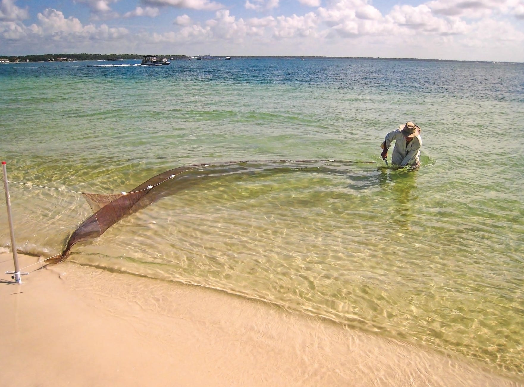 On this trip with Rock I tested my idea of how one man can work the 20-foot seine by himself. Take one of those auger-type sand drills used to support a beach umbrella and screw it into the beach at the water’s edge. Place one of the tubular aluminum net rods in it. Then one man takes the seine’s other rod and makes a net swing around the beach shallows and comes ashore with his catch.