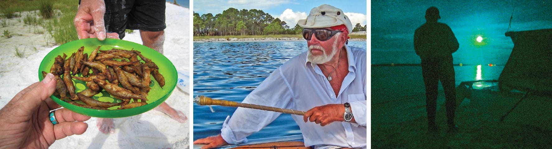 Folding beach chairs and a small folding canvas table are essential. Solid plastic containers with lock-down lids carry our galley of cooking items. Our bottled gas single-burner stove is an always reliable Coleman. One large pan is all we need for making camp coffee, boiling hotdogs in seawater, or for heating cooking oil for frying fish. Forget those gas lighters because the slightest breeze blows them out. We use special waterproof matches that light even when wet. You can find them on the Internet. Larger items go in plastic garbage bags or the Wal-Mart variety for smaller items and trash that we carry back to the mainland. Our dinner plates are unbreakable colorful Frisbees, fine for plate-ware or after-meal beach fun. Perishable food such as hotdogs and pre-made hamburger sandwiches is carried in a foot-square soft-sided insulated cooler with containers of frozen water. Four one-gallon plastic jugs of water are tied at the corner struts below the boat’s deck. All items requiring cool shade go into a small Quickdraw Self-Erecting tent that sits behind our umbrella. A rolled 20-foot seine net is used to catch our high protein fresh fish. One sweep of the net near shore provides more than enough fingerlings for deep-frying. The remainder is returned to the sea.