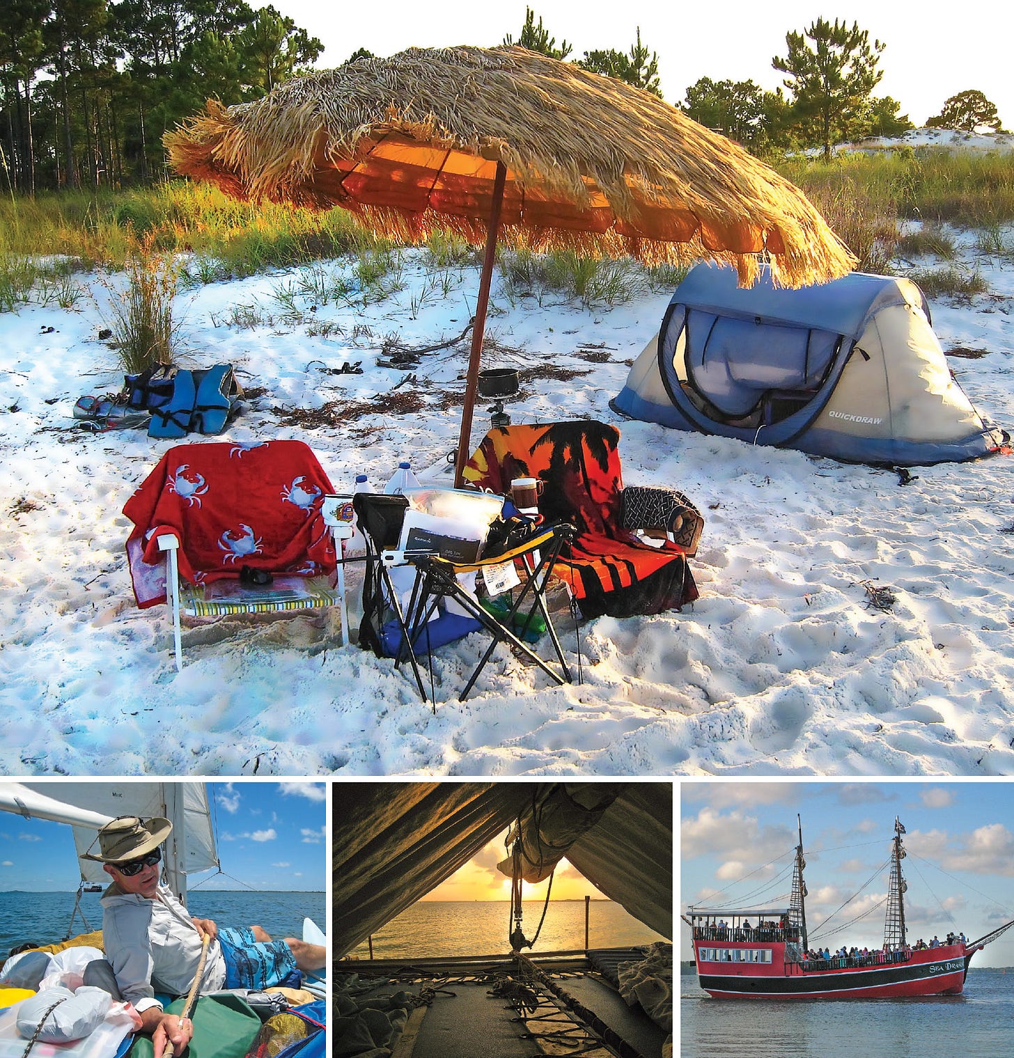 With northwest Florida’s June temperatures ranging from the high nineties during the day to the mid-seventies at night, if your boat is facing the sea-breeze you may get chilled during the night. We found that additional clothes resolved the issue, but so does turning the boat 90 degrees so that the sea breeze hits the tent’s flank.