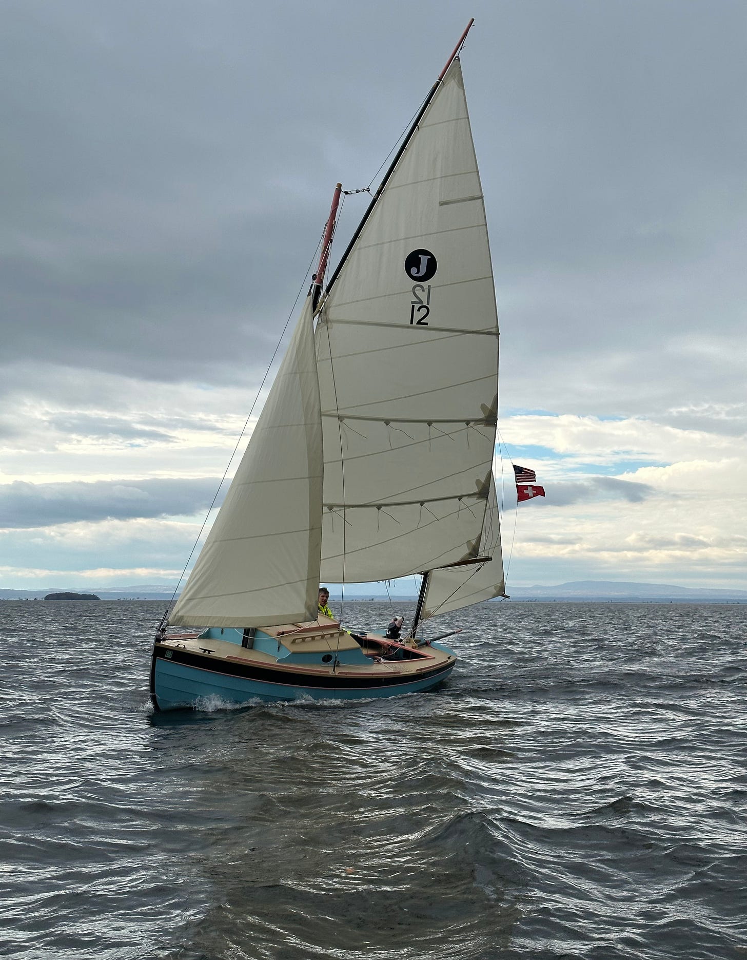 From John Hartmann: Josh, here is a photo of a Francois Vivier designed Jewell on northern Lake Champlain under dramatic October skies, smoking along with full sail in a fresh breeze.