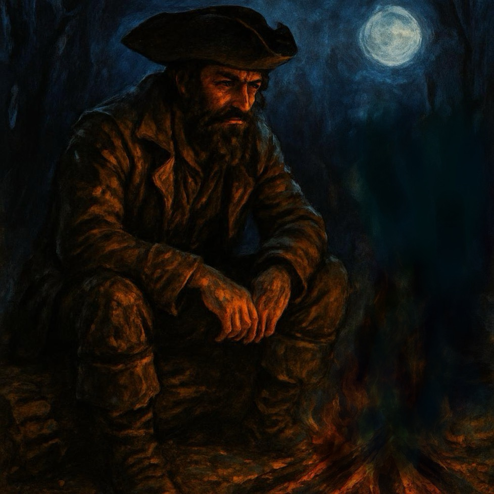 The figure continued to approach, offering only a grunt of acknowledgement. Eventually, he stepped fully into the glow of my headlamp, then slumped into a seated position on another log, facing me in the moonlit gloom. My first thought was that Halloween was still over a month away. It was a bit early for “Pirate Cos-play”.