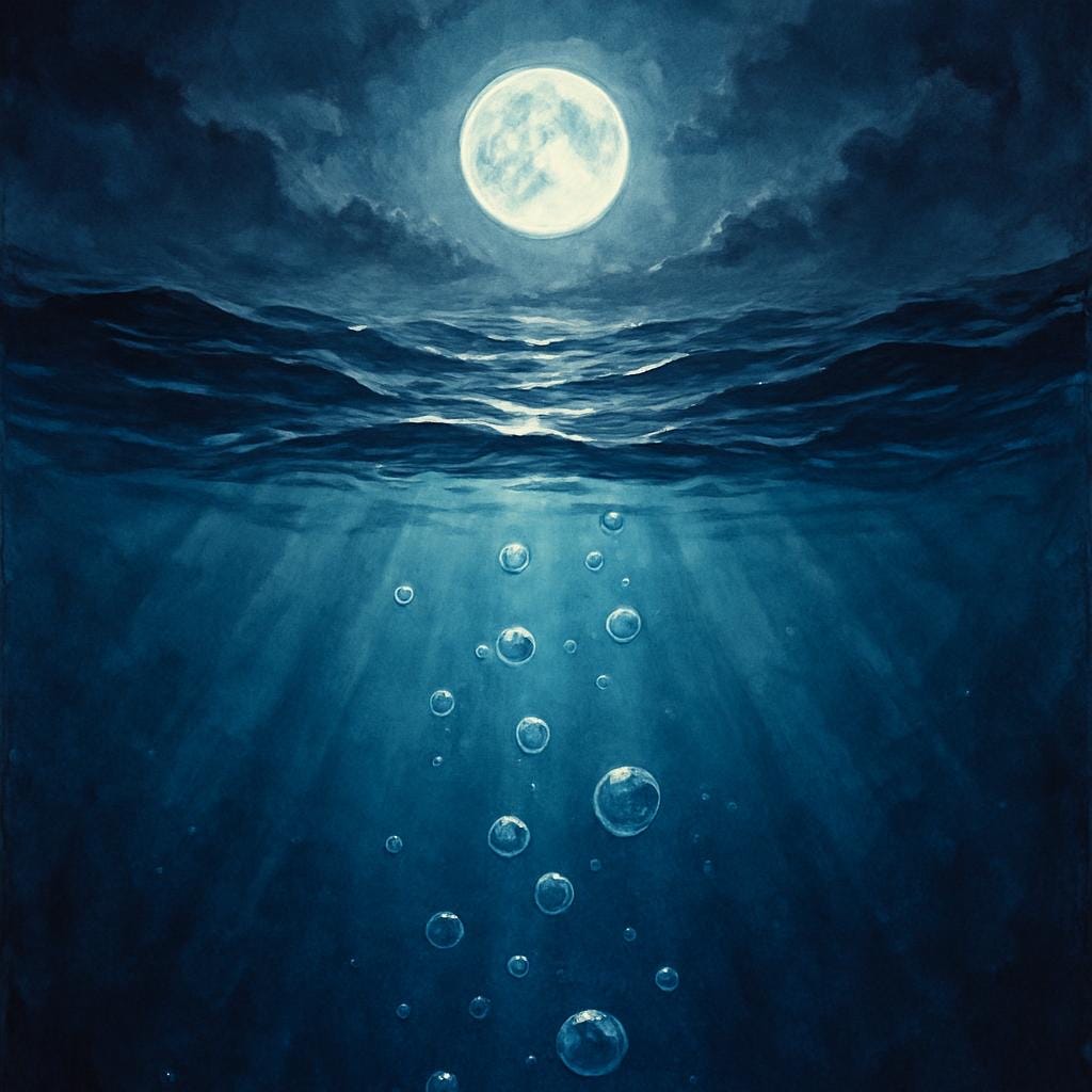 A searing pain coursed though my side. Finally, he pulled back the cutlass and with a brutal push, shoved me back into the water. I could see bubbles rise toward the obscured moon as I slowly sank below the surface. Then… blackness.