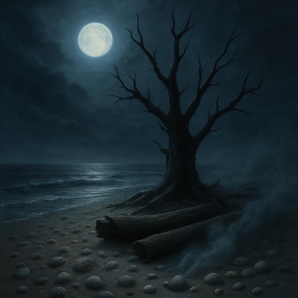 Suddenly, a shape appeared. A jagged, black tree, rising from a sandy mound a few hundred yards ahead. I reached down and opened the starboard lazarette. Reaching inside, I removed a gleaming cutlass and a small shovel.