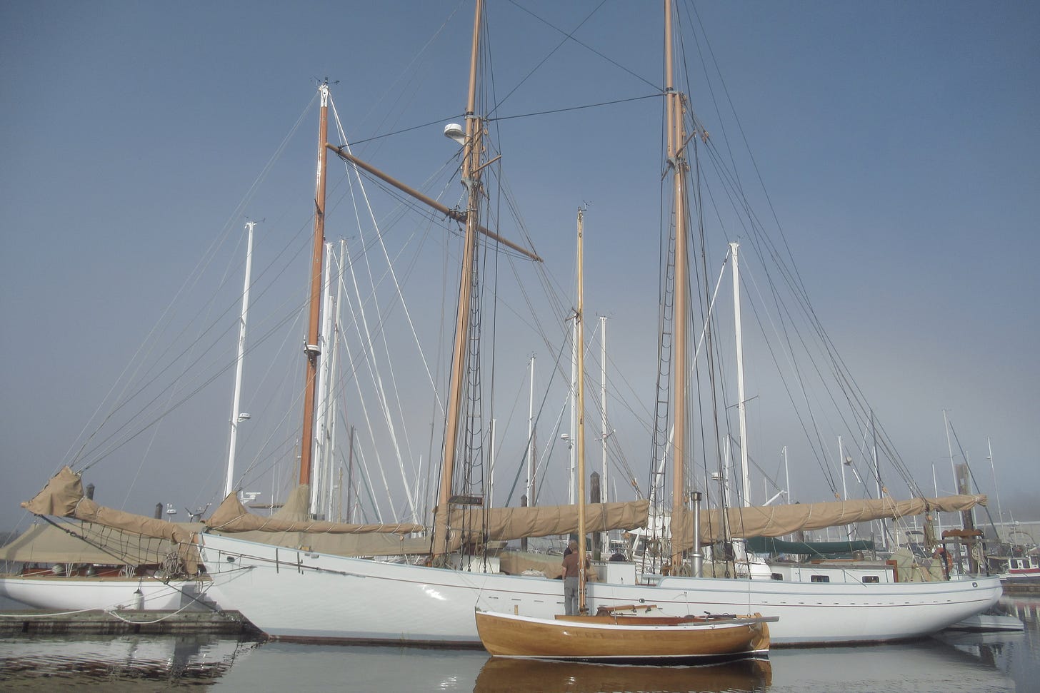 When you’re small, it pays to have big friends. In this case, big is Alcyone, a 65-foot-on-deck, wood-hulled, gaff-rigged schooner built in 1956 by Frank Prothero on Lake Union in Seattle and now moored in Port Townsend, WA. The small is Murrelet, a 19-foot, modified Augie Nielsen Spitzgatter design sloop. Built by Bertram Levy in Port Townsend from a toppled neighborhood locust tree (and milled by a local sawyer), Murrelet was launched in 2019. Trailerable, she was due for her yearly haul-out, and her mast needed to be removed for transport. Bertram, at 84 and with a lifetime of maritime resourcefulness, has a boat shop at his house, where Murrelet and several others have been built. She and her mast were headed back home for their yearly varnish refresh. Sugar Flanagan of Alcyone offered to help unstep Murrelet’s mast using Alcyone’s foremast yard.