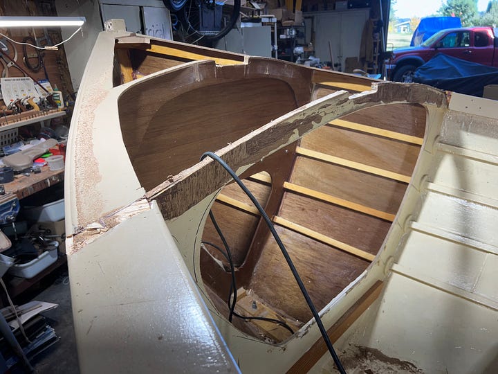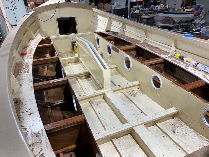 Part 1, November 13, 2024 (below) — We demolish everything related to a sailboat inside the hull: Side seats, bulkheads, foredeck, cockpit sole, outboard well meant for a tiny electric motor, and centerboard trunk…getting down to bare planks and frames, so we can start creating our beamy double-ended outboard cruiser.